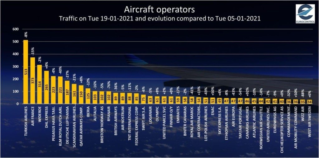 Crollo quasi verticale dei voli per molti vettori tra il 5/1 e il 19/1/21. La più pesante numericamente e’ quella di Ryanair dove la riduzione dei voli e’ del 76% con 102 voli operati. Quindi almeno 300 in un giorno sono stati tagliati. KLM che vola 221 voli, più del doppio di Ryanair e’ al -40%. Turkish Airlines ne muove 513 al giorno con un calo del -8%. Air France con 373% ha tagliato i volumi del 15%. Lufthansa ha operato 187 voli con un -27%, SAS e’ al -21%. Alitalia con 103 voli e un calo del 16% ne opera uno di più di Ryanair e British Airways con 89 e il 36% in meno.
