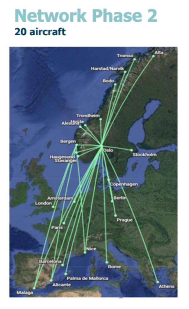 Flyr prevede di lanciare le prime destinazioni con due velivoli a giugno e di aumentare il numero a cinque a luglio e da sei a otto in autunno. Ciò consentirà di operare voli da Oslo verso sette destinazioni in Norvegia, oltre a Copenaghen, Nizza, Barcellona, Malaga e Alicante. Ulteriori piani includono lo sviluppo di collegamenti in Scandinavia e l’espansione in Europa.