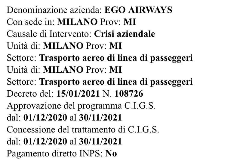 Il Ministero del Lavoro e delle Politiche e delle Politiche Sociali – Direzione Generale degli ammortizzatori sociali e della formazione – Divisione IV con decreto 108726 del 15/01/2021 ha autorizzato la CIGS alla Ego Airways dal 01/12/2020 al 30/11/2021.