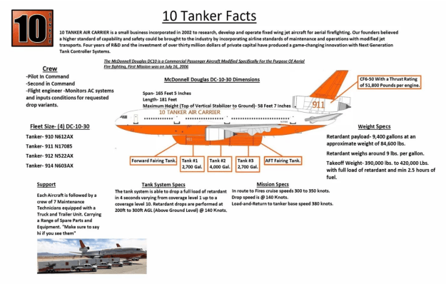 È umiliante ed emozionante. L’azienda descrive le sue attività: 10 Tanker opera dal 2006 come una delle poche flotte al mondo con VLAT (Very large air tankers) di recente sviluppo. I nostri DC-10 sono all’avanguardia in termini di prestazioni ed efficienza, con la capacità di fornire 9.400 galloni di ritardante di fiamma in 8 secondi e fino a un miglio di lunghezza. Creazione di linee di contenimento maggiori, in meno tempo risparmiando fauna selvatica e risorse. Anno dopo anno 10 Tanker risponde a centinaia di incendi, mentre consegna milioni di galloni di ritardante in tutto il mondo. La nostra missione è aumentare le capacità della lotta antincendio aerea e andare oltre per coloro che serviamo per proteggere.