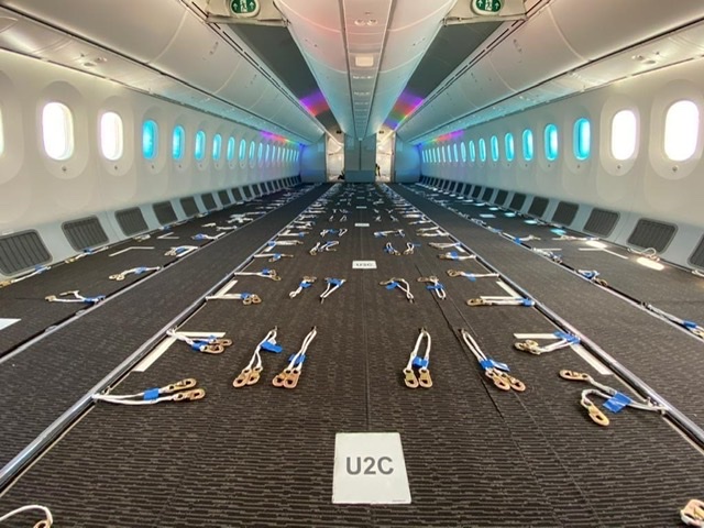Ha 46 tonnellate come massimo payload il primo B787 Kenya Airways transitato dalla configurazione passeggeri standard a “passengers to cargo“. Tutto ciò, e’ stato possibile con la rimozione di tutti i sedili. A seguire, la predisposizione delle aree per il posizionamento/stoccaggio merci In cabina passeggeri durante il volo. Anche le cappelliere, possono essere utilizzate come luoghi per stivare merce compatibile per dimensioni e pesi. Le stive principali ospitano una decina di pallets in tutto di merce contenuta sulle palette o containers.