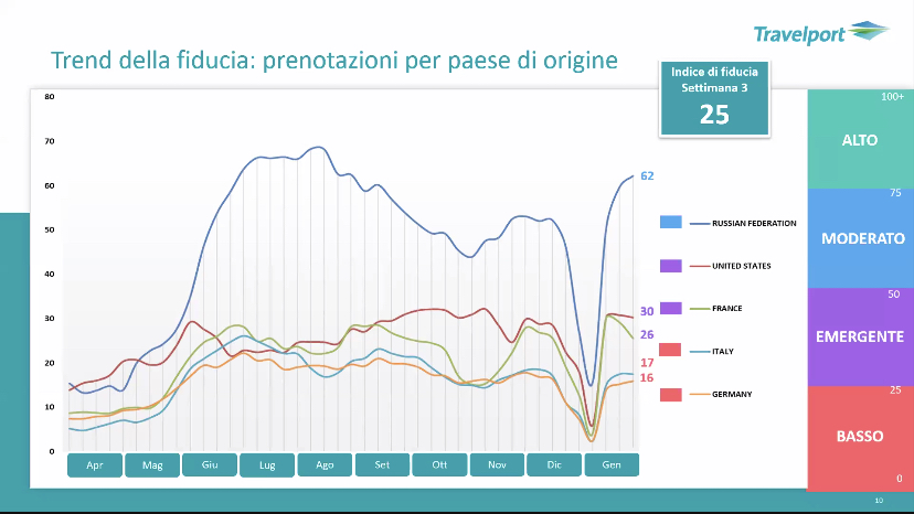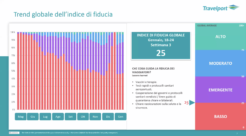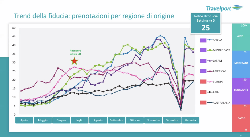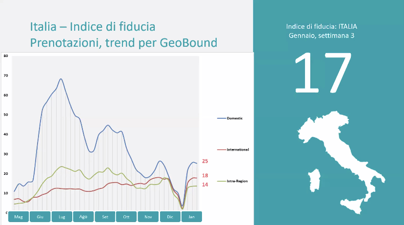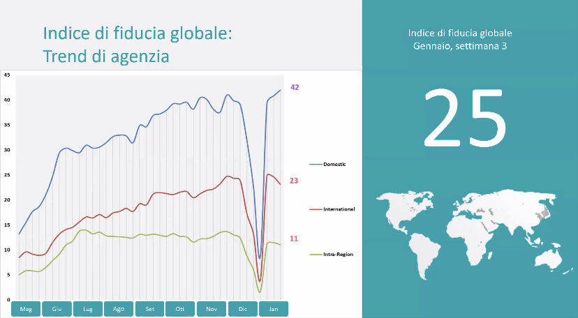 La fiducia globale cambia a seconda dei periodi e dalle situazioni contingenti. Il grafico parte da giugno 2020 e va fino alla terza settimana di gennaio 2021. Il trend in salita e’ crollato tra fine novembre e inizio gennaio. Ora e’ di nuovo in ripresa. Il più rapido e’ quello domestico, il più lento l’intercontinentale.