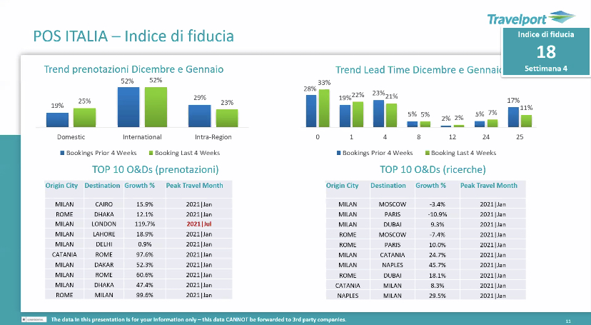 Qui l’andamento di prenotazioni e ricerche sotto e sopra le quattro settimane e i differenziali per le prime 10 rotte del mercato Italia.