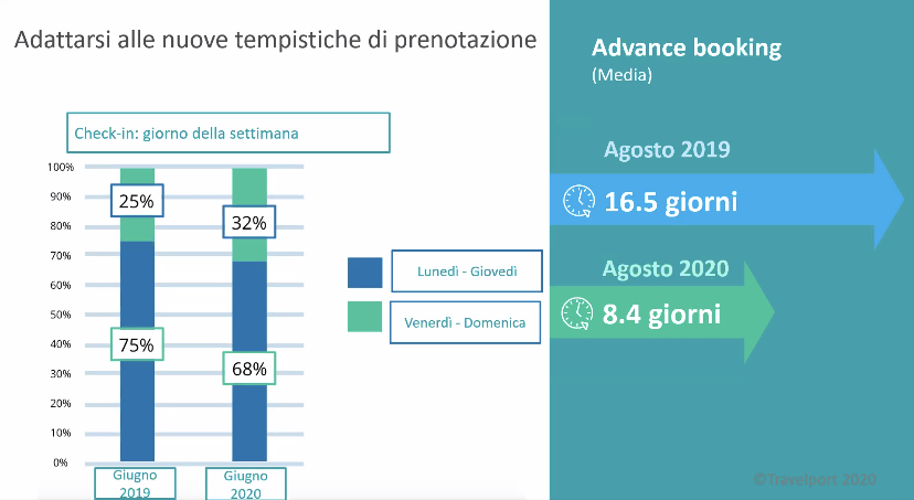 Le analisi di Travelport, uno dei tre GDS sul mercato, sono chiare sullo stato attuale del mercato, oggi afflitto dal Covid-19. Un chiaro segnale e’ stato il dimezzamento del periodo di advance booking, nel giro di un anno da agosto 2019 allo stesso mese del 2020, da 16,5 a 8,4 giorni. Non c’è’ più traccia degli acquisti lontani nel tempo. Un classico del passato. Un cash flow costante per i vettori.