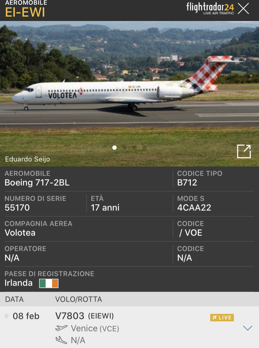 E’ partito poco prima di mezzogiorno da Venezia il Boeing 717-2BL EI-EWI. Anche questo aereo avrà come destinazione finale Victorville in California. Gli scali saranno Keflavik, Goose bay, Winnipeg. Non effettuerà stop a Stavanger, come diversamente ha effettuato il velivolo partito in precedenza. A Venezia altri 6 aereo dello stesso tipo sono al momento in attesa di concludere il tendering al lessor.