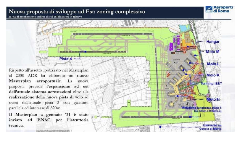 Il nuovo Fiumicino e’ stato presentato, il progetto e’ stato attualizzato e prevede in espansione verso est, con la nuova pista 4, a fianco della esistente 16L/34R. L’investimento sarà di 8,2 miliardi di €. Viene così cancellato tutto il terminal nuovo da costruire a nord.