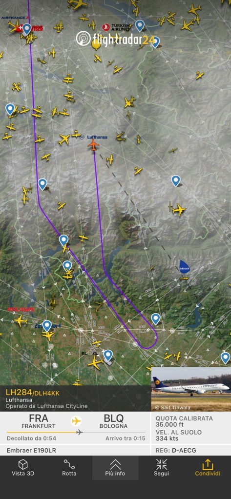 Ritorna verso la Germania il volo LH284 da Francoforte a Bologna. L’aereo, un E190LR quando raggiunta la verticale di Bergamo a FL350 ha virato a sinistra e sta ritornando presumibilmente all’aeroporto di partenza. Il velivolo dalle marche D-AECG non ha modificato quota e codice sul transponder.