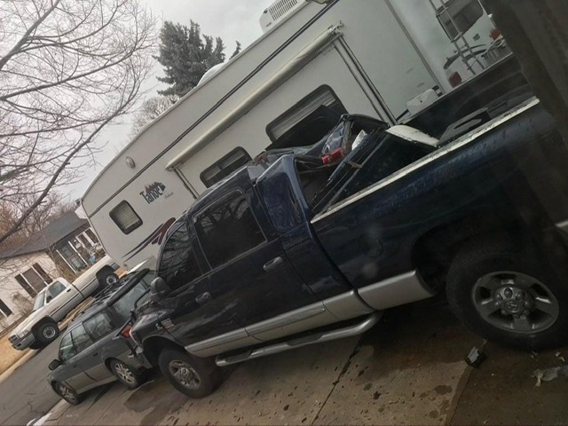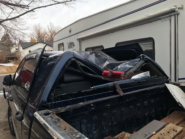 Qui sopra una tubazione trovata in mezzi a questa strada di questo quartiere residenziale, a seguire i danni a un pick up.