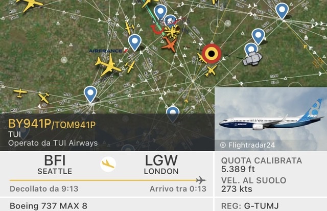 Fra qualche minuto a Londra Gatwick atterrerà il primo Boeing 737-8 MAX G-TUMJ assolutamente non stop da Boeing Field a Seattle.