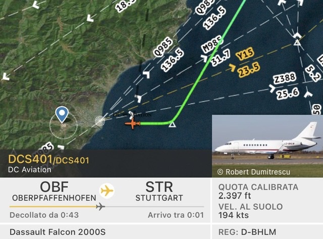 Un Dassault Falcon 2000S e’ da poco atterrato a Albenga proveniente da Oberpfaffenhofen. E’ un aeroporto non lontano da Monaco di Baviera. E’ della DCS Aviation con le marche D-BHLM. Lo scalo ligure sulla Riviera di Ponente e’ sede di Piaggio, ma ai tempi che furono, cioè gli anni 60/70 era metà di voli charter passeggeri per la costa e voli cargo per il trasporto di fiori d piante in nord Europa.