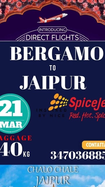 Questa locandina gira sui social da un paio di giorni. Promuove il nuovo volo charter destinato al traffico etnico da Bergamo per Jaipur. Il volo e’ dal prossimo 21 marzo con la compagnia SpiceJet, la quale opera già su Amritsar e Delhi.