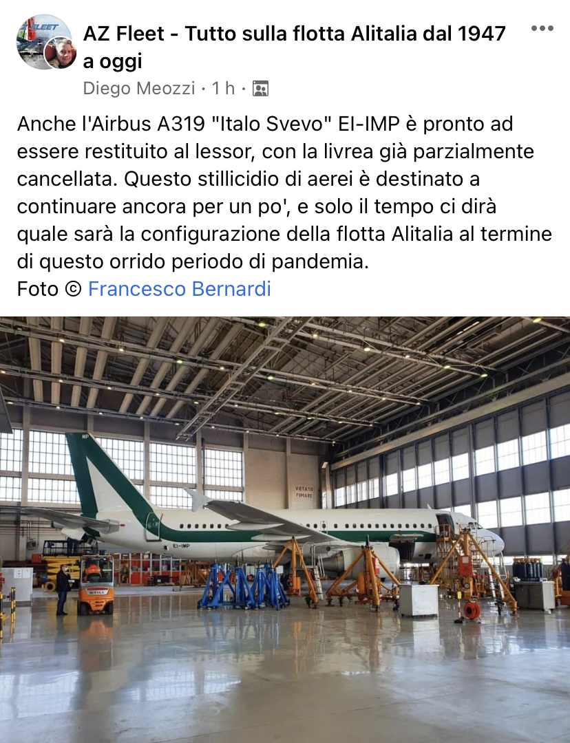 E’ l’A319-111 EI-IMP, il primo aereo di questo tipo ad essere radiato. E’ in hangar, secondo quanto riporta AZ Fleet con l’immagine pubblicata sui social media.