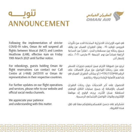 Oman Air a partire da venerdì 19 marzo sospende i voli tra Muscat e Londra Heathrow fino ad ulteriore futura comunicazione.