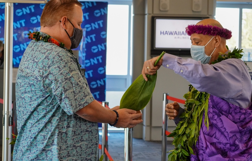 Jeff Helfrick, vice presidente delle operazioni aeroportuali di Hawaiian Airlines e Keoni Martin partecipano a una benedizione di HA73