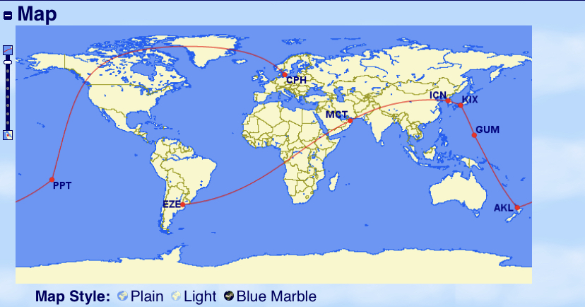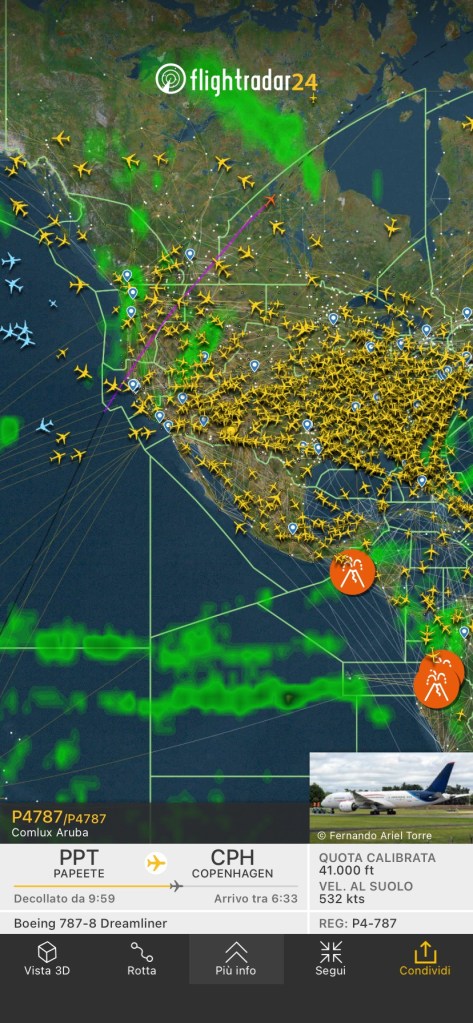 Avevamo lasciato tra Osaka e Guam, il Boeing 787-8 P4-787 della Comlux Aruba! Poi ha proseguito da Guam a Auckland, dove ha sostato ed e’ proseguitò su Papeete in Polinesia Francese. Oggi e’ decollato, anzi ieri secondo l’ora locale per Copenaghen, il tutto non stop in 16 ore 32 minuti. E’ sul Canada del nord a 10 ore dalla partenza. La quota di crociera e’ FL410. Questa sera sarà a Copenaghen.