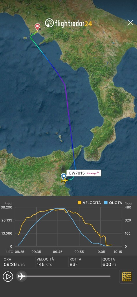 Ieri mattina, l’A319-132 D-AGWV della Eurowings, dove il volo EWG7815 da Catania a Amburgo, dopo aver raggiunto la quota di FL380 mantenuta per meno di cinque minuti, ha impostato una rapida discesa, ricevendo un vettore radar per stabilizzarsi poi a meno di una decina di miglia dall’aeroporto di Napoli. L’atterraggio e’ stato per pista 06. L’aereo e’ poi ripartito per Amburgo meno di un ora dopo. Nell’immagine tratta da Flightradar24, c’è’ il grafico di velocità e’ quota del volo.