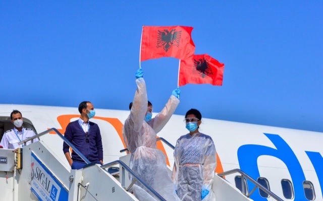 Sventolano le bandiere albanesi e il water cannon salute. Due i voli settimanali tra le due città per il primo collegamento con il Golfo Persico dall’Albania.