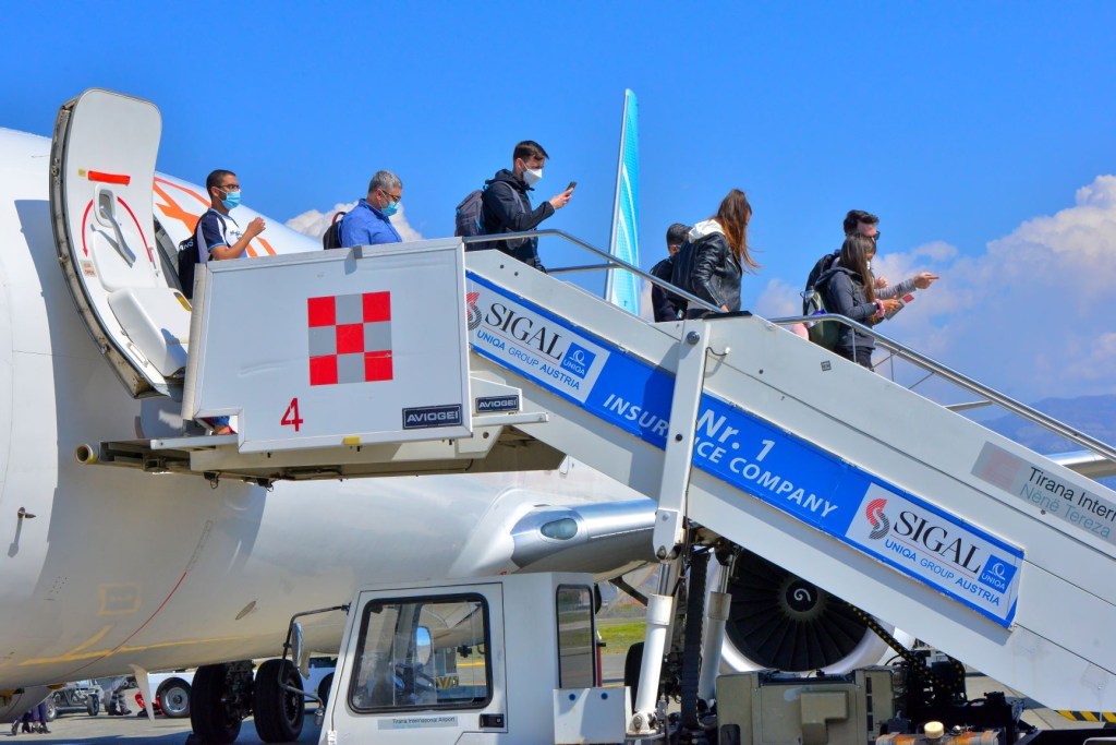 I primi passeggeri scendono sotto un bellissimo sole a Tirana.