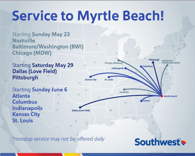 Nella prima settimana di servizio: Baltimora / Washington (BWI), Chicago (Midway) e Nashville; e un servizio aggiuntivo non-stop da Dallas (Love Field) e Pittsburgh opererà il sabato a partire dal 29 maggio. Una terza ondata di voli per questa destinazione sul tratto della costa della Carolina del Sud offrirà opzioni per volare con Southwest non-stop da Atlanta, Columbus e Indianapolis a partire da giugno 6, 2021.