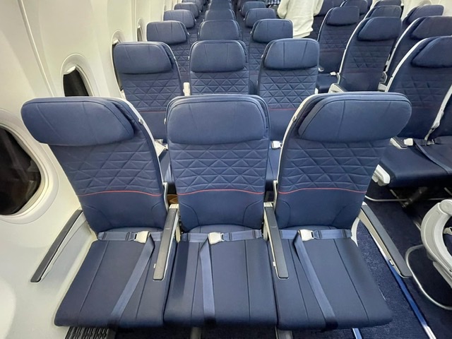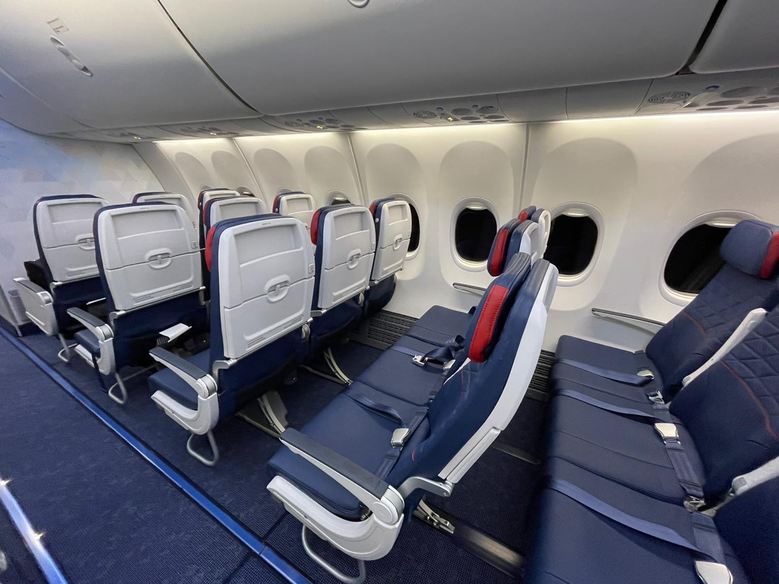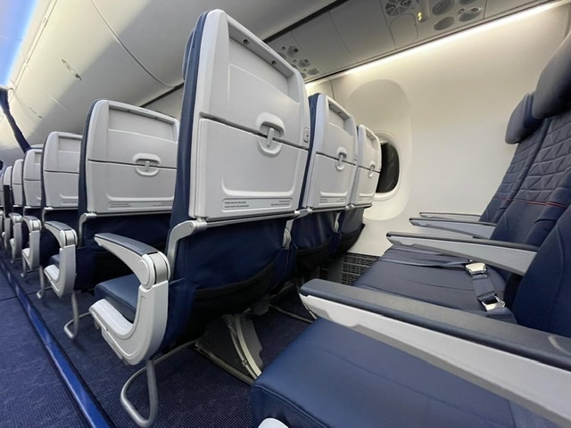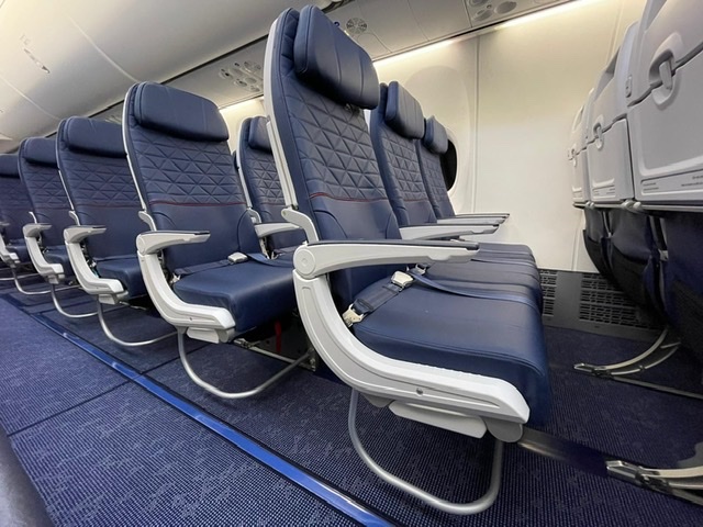 189 posti in abreast da 3 più 3, slim in simil pelle blu.