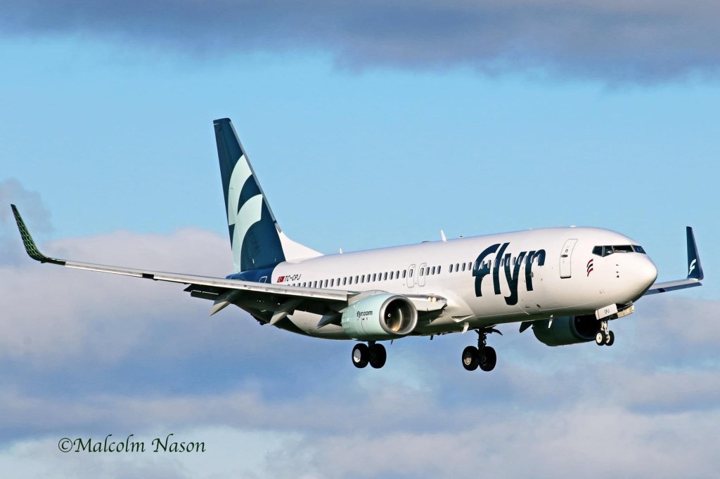 Dopo essere stato verniciato, il primo aereo per Flyr ha spiccato il volo. Il Boeing 737-82R TC-CPJ era giunto da Istanbul il 31 marzo scorso. Ora con i colori della Flyr, a breve assumerà le marche LN-FGB. La foto e’ di Malcolm Nason. Questo e’ il primo aereo a essere consegnato al nuovo vettore low cost norvegese. L’aereo sta volando ancora sotto l’AOC Pegasus. Il volo e’ stato di due ore.