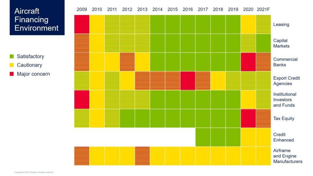 Boeing prevede che finanziamenti globali e diversificati continueranno a confluire nel settore del finanziamento degli aerei nel momento in cui il settore dell’aviazione si trova ad affrontare la pandemia e la diffusione dei vaccini continua ad accelerare.