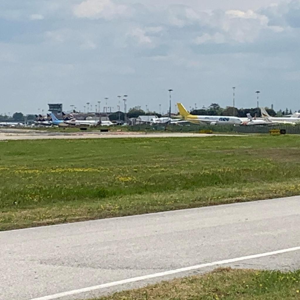 Spicca l’aereo grigio scuro metalizzato con fasce arancioni di Max Verstappen, oppure il Falcon 7X della Liberty Media giunto poco dopo il mezzogiorno di ieri direttamente da Denver, sopra nella foto.