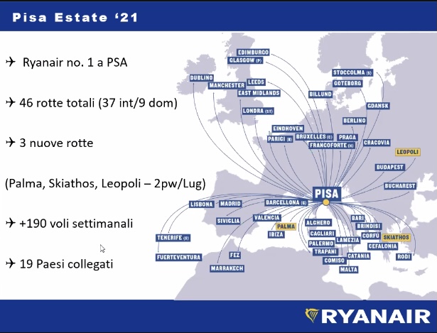 L’operativo di Ryanair per l’estate ’21 su Pisa includerà: