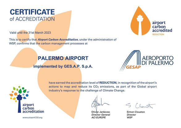 L’importante riconoscimento è stato assegnato a seguito dell’approvazione da parte dell’Airport Council International (ACI) – l’associazione degli aeroporti europei – del documento “Carbon Management Plan” predisposto dalla Gesap – la società di gestione dell’aeroporto di Palermo – e valutato dall’ente di certificazione TUV.