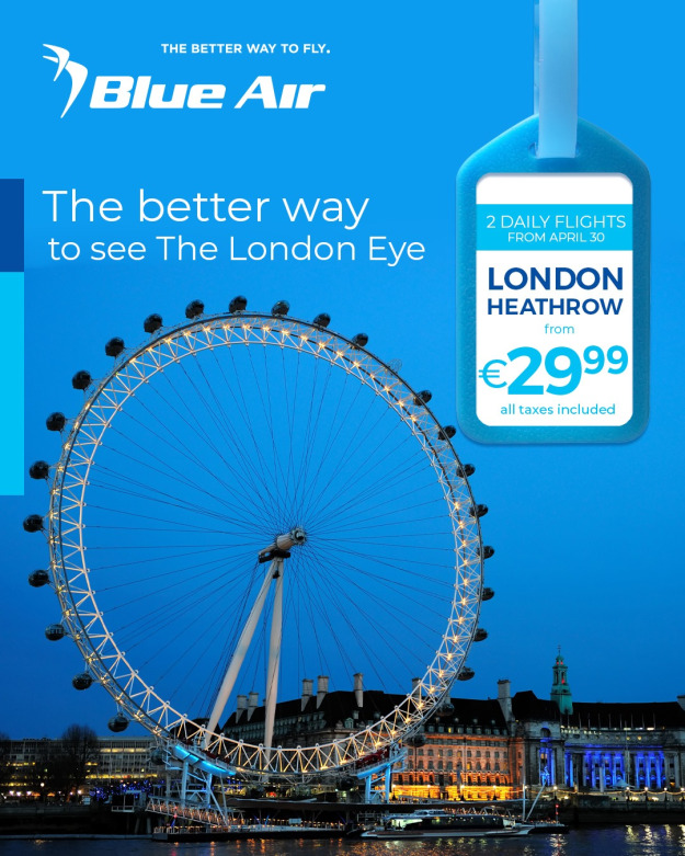 Blue Air opera un doppio servizio giornaliero tra Bucarest e Londra Heathrow Airport T2, diventando il più grande vettore su questa rotta.