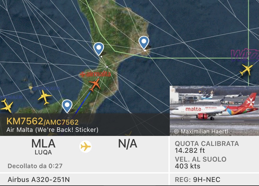 Nella foto il A320-251N Air Malta mentre sta raggiungendo Lamezia Terme da Malta.