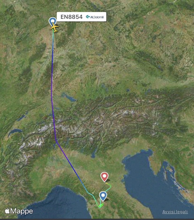 Nella foto la rotta dell’aereo Air Dolomiti.