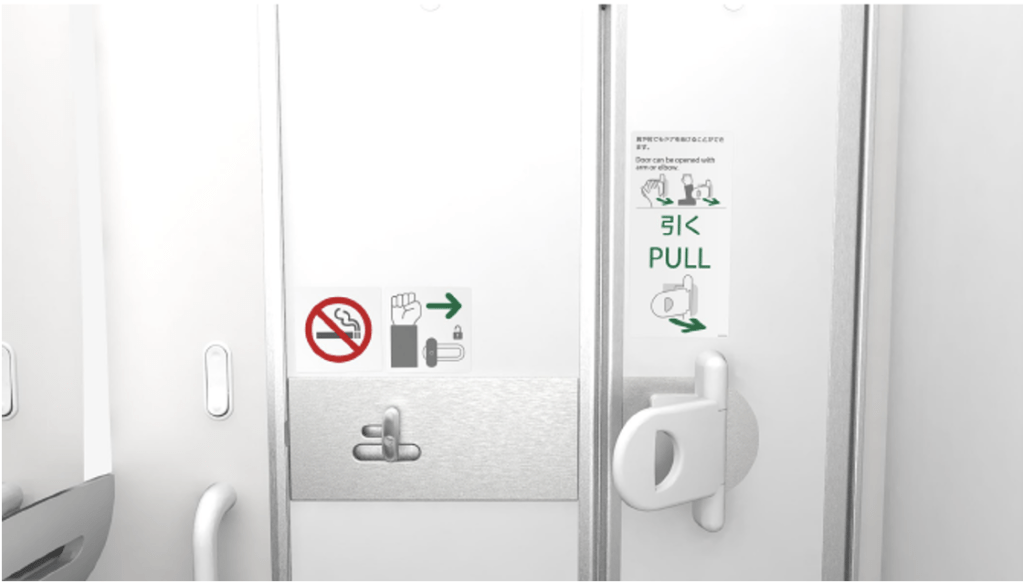 La nuova porta è dotata di una grande manopola interna di chiusura e di una maniglia aggiuntiva, in modo che i passeggeri possano usare i gomiti per sbloccarla. Poiché il meccanismo di apertura è diverso da quelli che si trovano su altri aerei, la segnaletica è stata posta vicino alla toilette per fornire istruzioni sull’utilizzo.