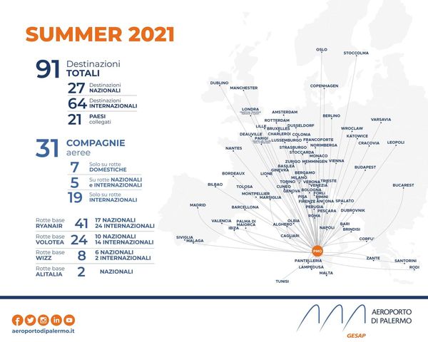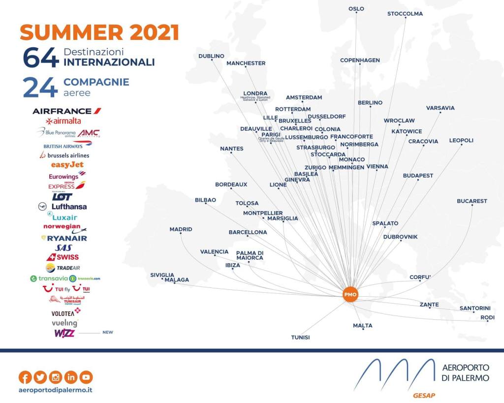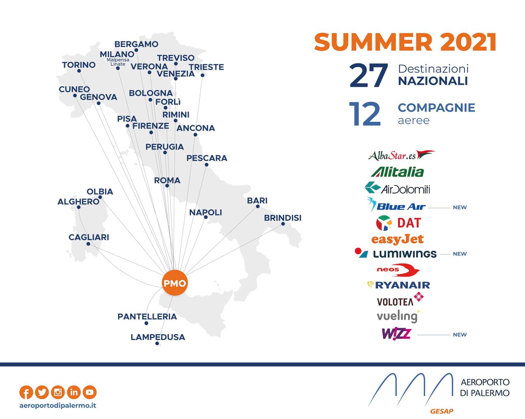91 destinazioni (27 nazionali e 64 internazionali) per collegare 21 Paesi; 31 compagnie aeree (4 operano per la prima volta su Palermo: Blue Air, Lot, Lumiwings e Wizz Air); una nuova base aerea Wizz Air, che si aggiunge alle esistenti di Alitalia, Ryanair e Volotea.