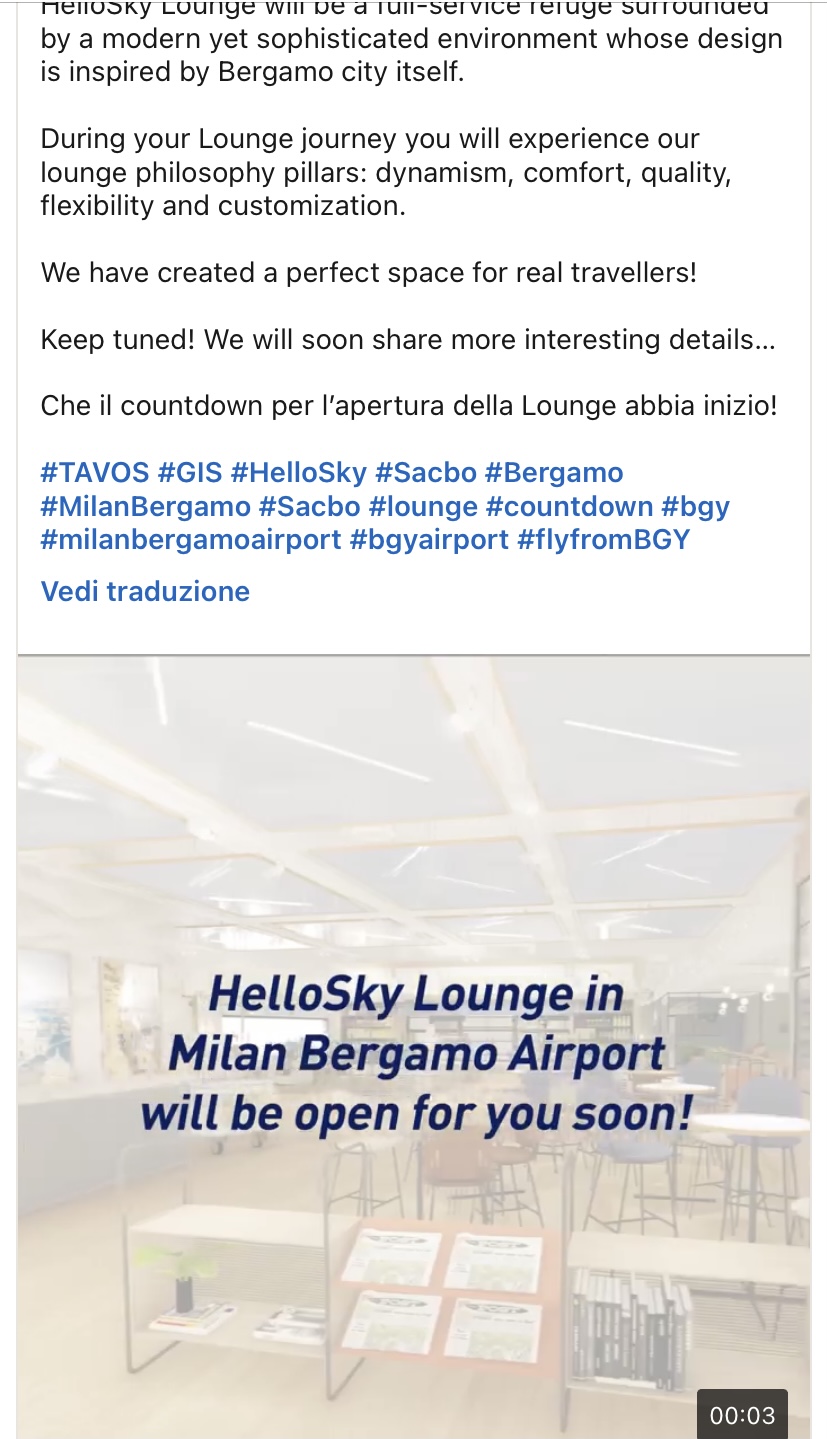 La seconda lounge in Italia di Hello Sky sarà dal mese di giugno a Bergamo. La prima fu aperta a Roma Fiumicino.