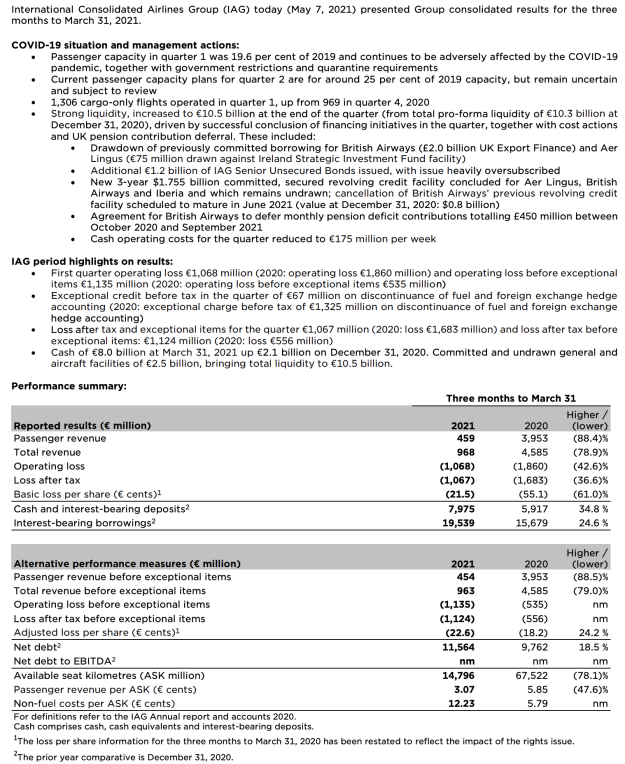 International Consolidated Airlines Group (IAG) ha presentato oggi (7 maggio 2021) i risultati consolidati del Gruppo per i tre mesi fino al 31 marzo 2021.