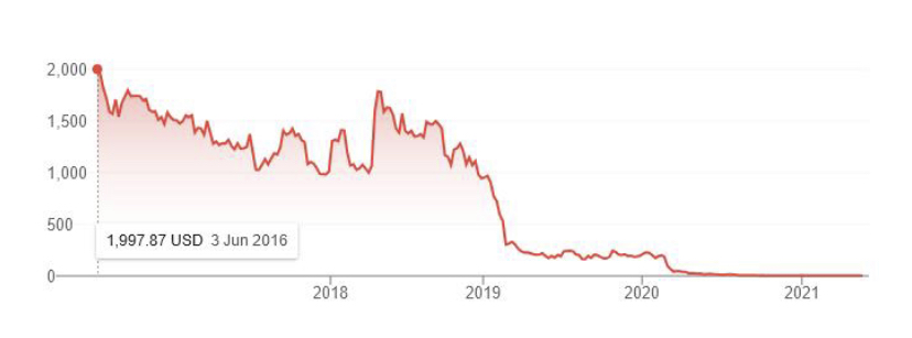 Dal grafico si vede negli ultimi cinque anni come si e’ dilapidato il valore del vettore. Dai quasi 2 miliardi di $ del 6 giugno 2016 ai qual è centinaio di milioni del 2019. Quindi, senza gli effetti della pandemia, poi azzerato nel 2020, ma oramai il danno era già stato fatto.
