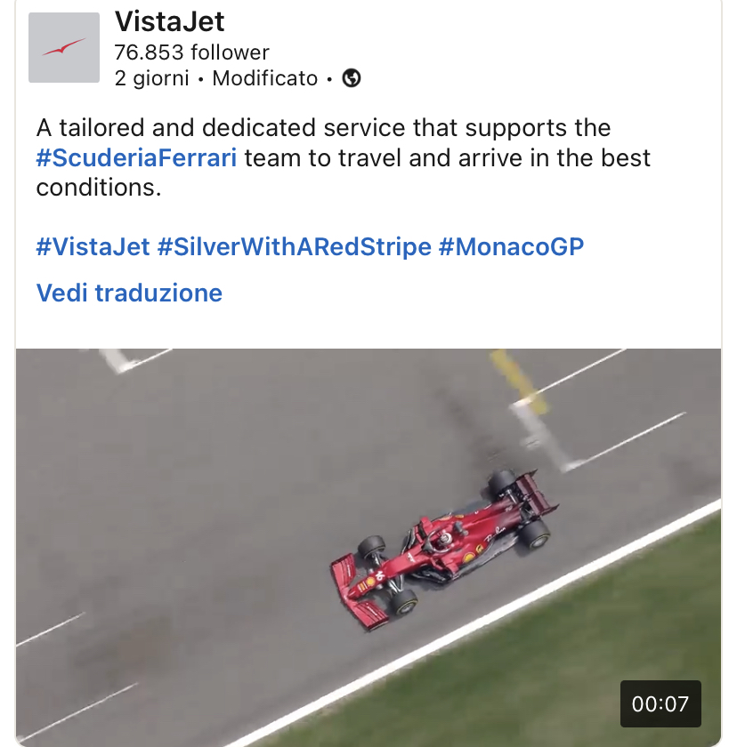 Sulla sua pagina LinkedIn la VistaJet riporta la sua partnership con Ferrari.