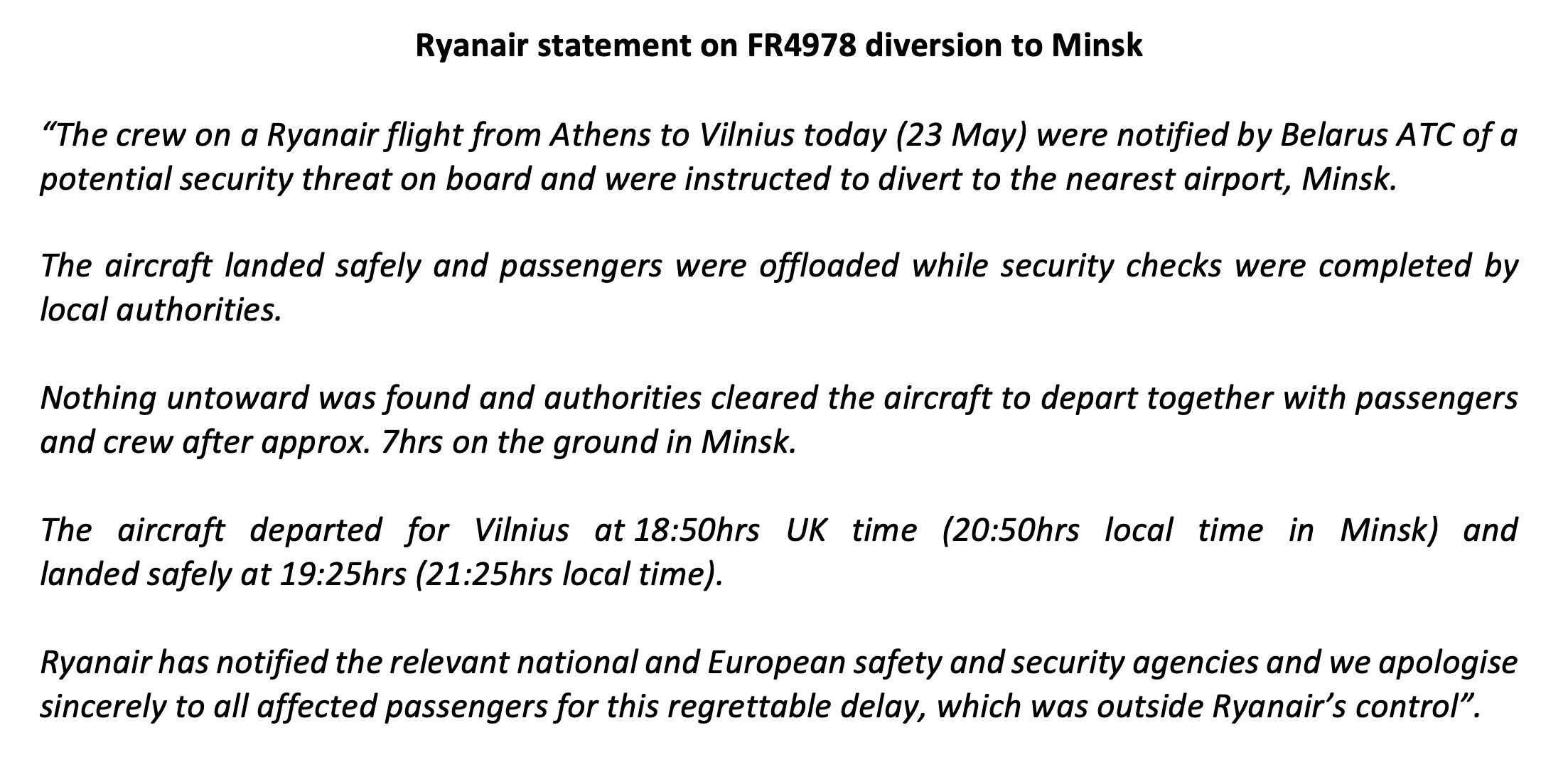 Da Twitter Ryanair Press Office, parla dell’accaduto di ieri al volo da Atene a Vilnius, poi atterrato a Minsk per un sospetto allarme bomba notificato all’equipaggio quando in volo dall’ATC Bielorusso. Nel scorrere il comunicato si parla dello sbarco dei passeggeri in tono generico, delle verifiche che non hanno portato a nulla e della ripartenza per Vilnius dopo sette ore e le scuse per i ritardi. Ma del passeggero trattenuto a terra a Minsk e poi arrestato…nulla! Mah.