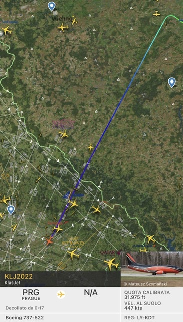 E’ decollato da Praga una ventina di minuti fa il B737-522 LY-KDT della KlasJet diretto a Bolzano con la Nazionale della Repubblica Ceca, che andrà in ritiro a Valles. Poi l’aereo fra qualche giorno si sposterà a Bologna, perché c’è’ un incontro con la Nazionale Italiana. Quindi ritornerà a Bolzano per poi ripartire il 6 come riporta il quotidiano Alto Adige.