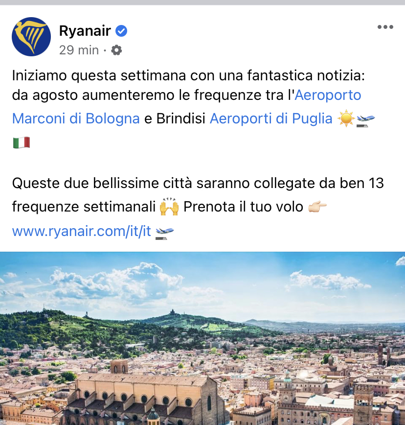compagnie aeree Ryanair aumenta i voli tra Bologna e Brindisi Pubblicato da Italiavola il 31 Maggio 2021 Questa e’ la comunicazione appena rilasciata sulla pagina Facebook di Ryanair, che aumenta a 13 voli settimanali le frequenze se disponibili tra Bologna e Brindisi. La rotta e’ anche operata da Wizz dal 2 luglio con quattro voli alla settimana. Condividi: Fai clic per condividere su Facebook (Si apre in una nuova finestra) Facebook Fai clic qui per condividere su LinkedIn (Si apre in una nuova finestra) LinkedIn Fai clic qui per condividere su Reddit (Si apre in una nuova finestra) Reddit Fai clic qui per condividere su Pinterest (Si apre in una nuova finestra) Pinterest Fai clic qui per condividere su Tumblr (Si apre in una nuova finestra) Tumblr Fai clic per condividere su X (Si apre in una nuova finestra) X Mi piace Caricamento... Correlati
