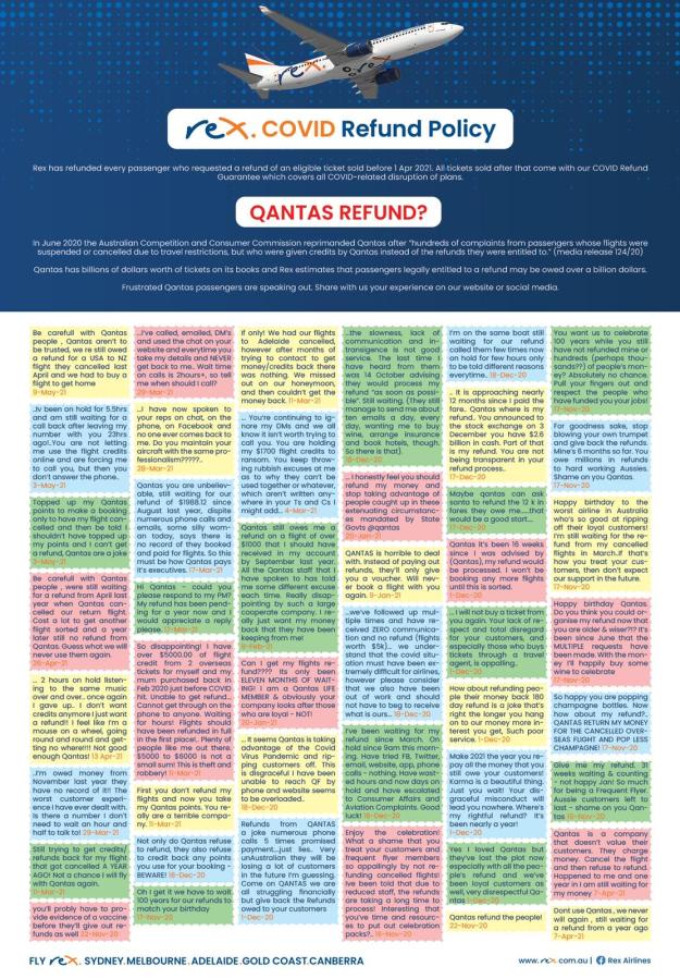 Rex lo sta facendo perché ritiene che il modo migliore per ricostruire la fiducia nel volare di nuovo sia quello di fornire agli australiani la massima tranquillità contro qualsiasi interruzione correlata al COVID, fornendo rapidamente un rimborso completo in contanti.