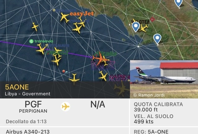 E’ un A340-200, quello del Governo Libico, si quello di Gheddafi, era in sosta da anni a Perpignan, ora e’ ripartito e viene riportato in consegna presumibilmente verso Tripoli Mittiga. L’aereo con le marche 5A-ONE e’ ora a FL390 sul Tirreno a ovest di Napoli.