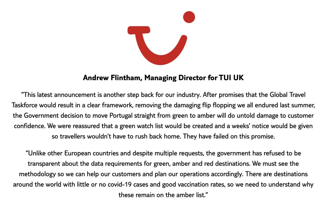 Andrew Flintham – MD di TUI UK usa parole dure nei confronti dell’esecutivo Johnson. “L’ultimo annuncio e’ un passo indietro”, infatti con una gestione scellerata della politica dei colori dei paesi esteri minaccia l’esistenza del comparto turistico della vacanza organizzata. Nonostante le rassicurazioni della Global Travel Taskforce, l’ultima mossa e’ stata quella di riposizionare il Portogallo da verde a ambra. Oltre a non riconsiderare la posizioni di altri paesi.