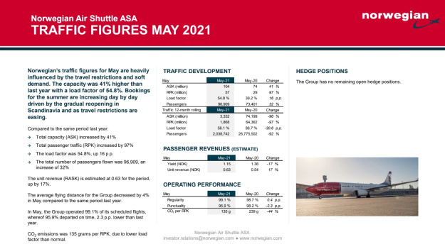 I dati sul traffico di Norwegian per maggio continuano a essere influenzati dalle restrizioni sui viaggi internazionali e quindi dalla bassa domanda. Tuttavia, il numero di passeggeri ha mostrato un notevole aumento del volume in linea con il lancio delle vaccinazioni e le modifiche alle restrizioni all’ingresso e ai regolamenti di quarantena.