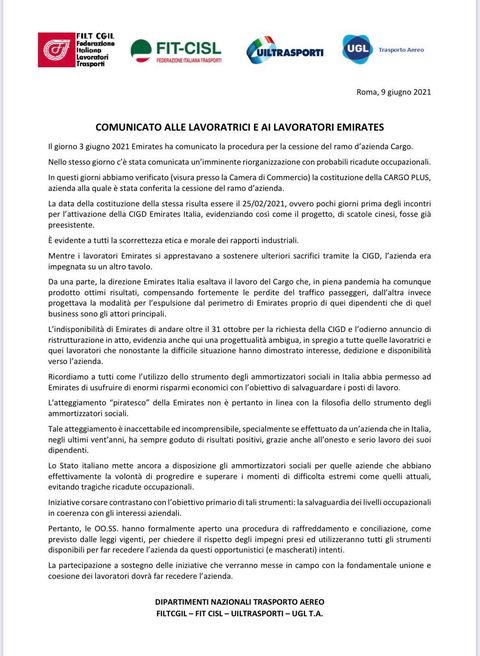 compagnie aeree Emirates in Italia cede il ramo cargo al GSA Cargoplus. protestano i sindacati Pubblicato da Italiavola il 9 giugno 2021 Il ramo cargo di Emirates in italia sarà ceduto a Cargoplus. Nell’immagine il comunicato sindacale congiunto delle organizzazioni confederali. Condividi: Fai clic per condividere su Facebook (Si apre in una nuova finestra) Facebook Fai clic qui per condividere su LinkedIn (Si apre in una nuova finestra) LinkedIn Fai clic qui per condividere su Reddit (Si apre in una nuova finestra) Reddit Fai clic qui per condividere su Pinterest (Si apre in una nuova finestra) Pinterest Fai clic qui per condividere su Tumblr (Si apre in una nuova finestra) Tumblr Fai clic per condividere su X (Si apre in una nuova finestra) X Mi piace Caricamento... Correlati