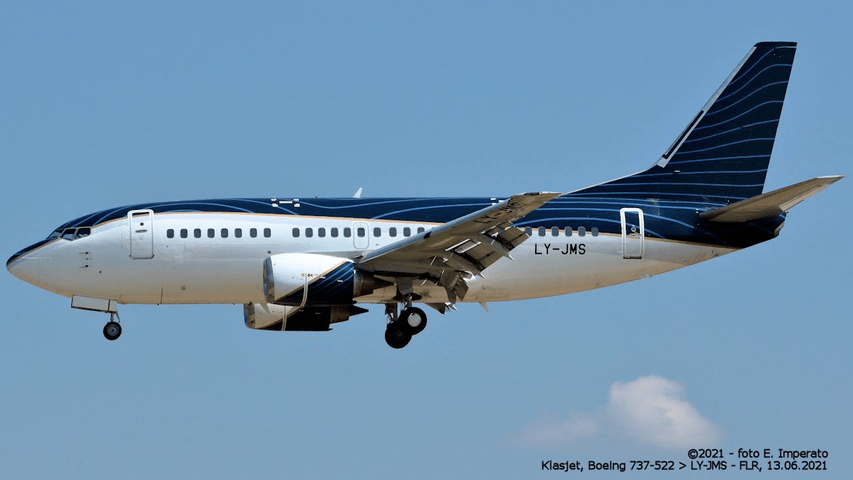 Questo Boeing 737-522 LY-JMS è arrivato ieri a Firenze. L’aereo è della compagnia aerea lituana KlasJet impegnata in voli executive. Il velivolo è giunto da Bruxelles. Il velivolo è tuttora fermo a Firenze. La foto è di E.Imperato via Vincenzo Gentile.
