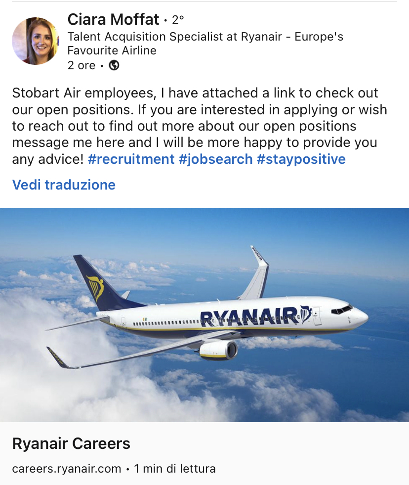 Ciara Moffat di Ryanair su LinkedIn invita i lavoratori della compagnia irlandese a consultare Ryanair Carreer per consultare le posizioni aperte. Oppure contattandola via LinkedIn.
