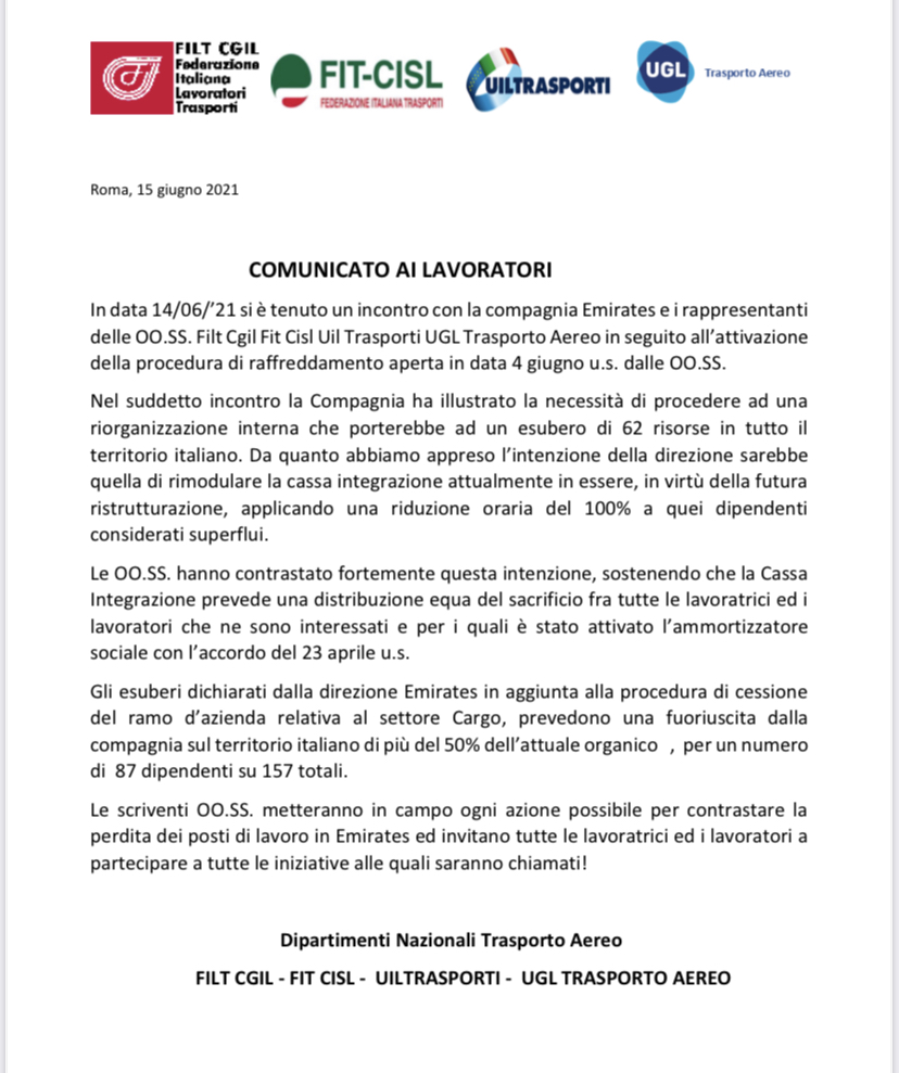 87 su 157 gli esuberi dichiarati da Emirates in Italia. E’ oltre il 50% dell’attuale forza lavoro. Tante le risorse umane, che perderanno il lavoro dal piano di ristrutturazione del vettore arabo comunicato alle organizzazioni sindacali italiane. Quasi certamente avrà pesato l’ultimo bilancio del Gruppo, chiuso con una perdita di 6 miliardi di Dollari USA.
