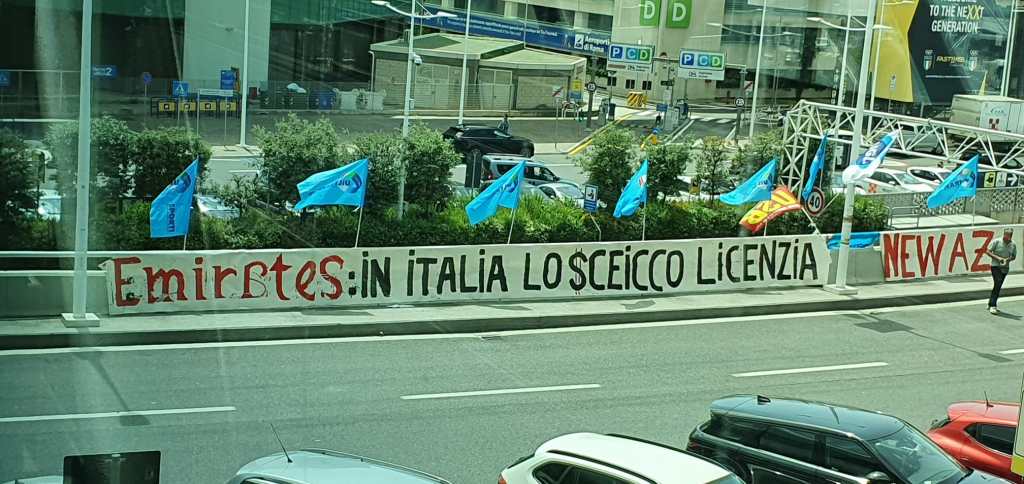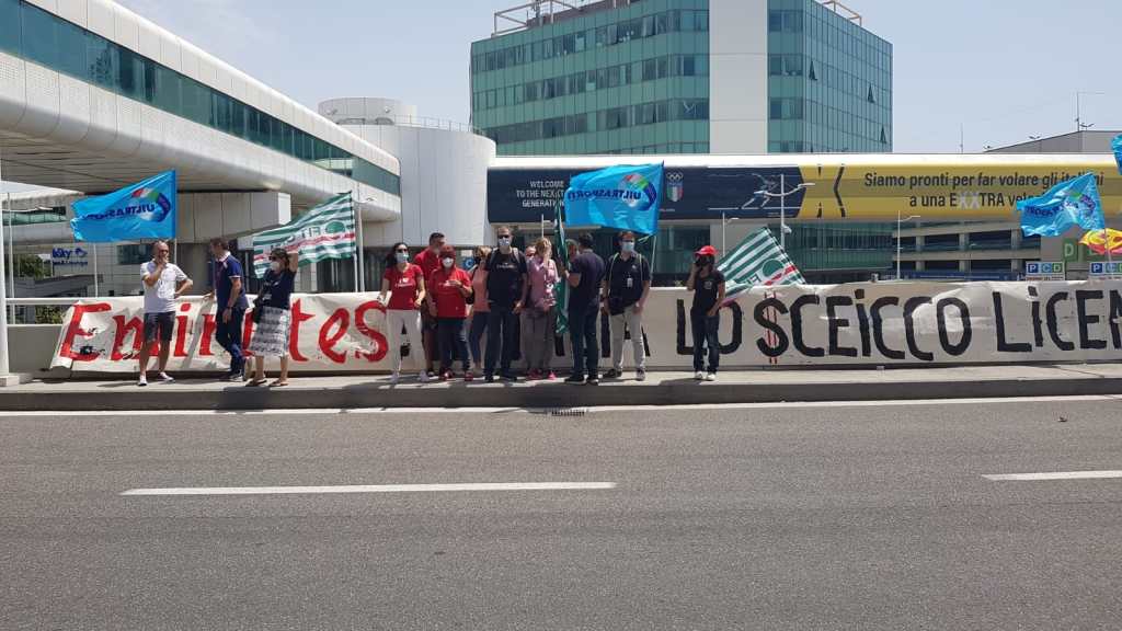 Nella foto e’ ora in atto a Roma Fiumicino, la protesta dei lavoratori Emirates.